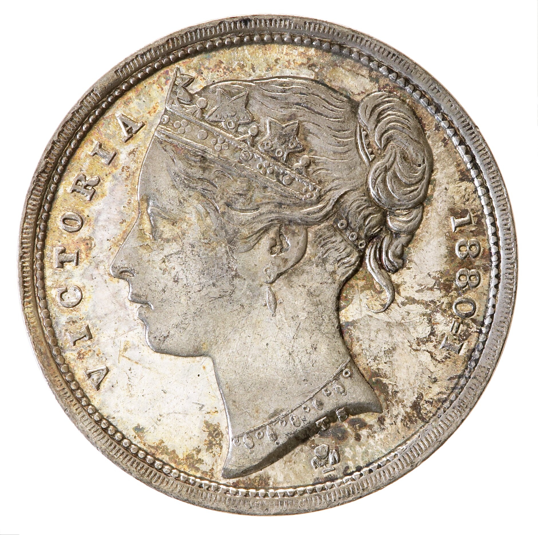 Head of Queen Victoria facing left, wearing coronet and necklace of pearls; around VICTORIA 1880-1 and in tiny letters on the truncation the srtists initials, T.S.