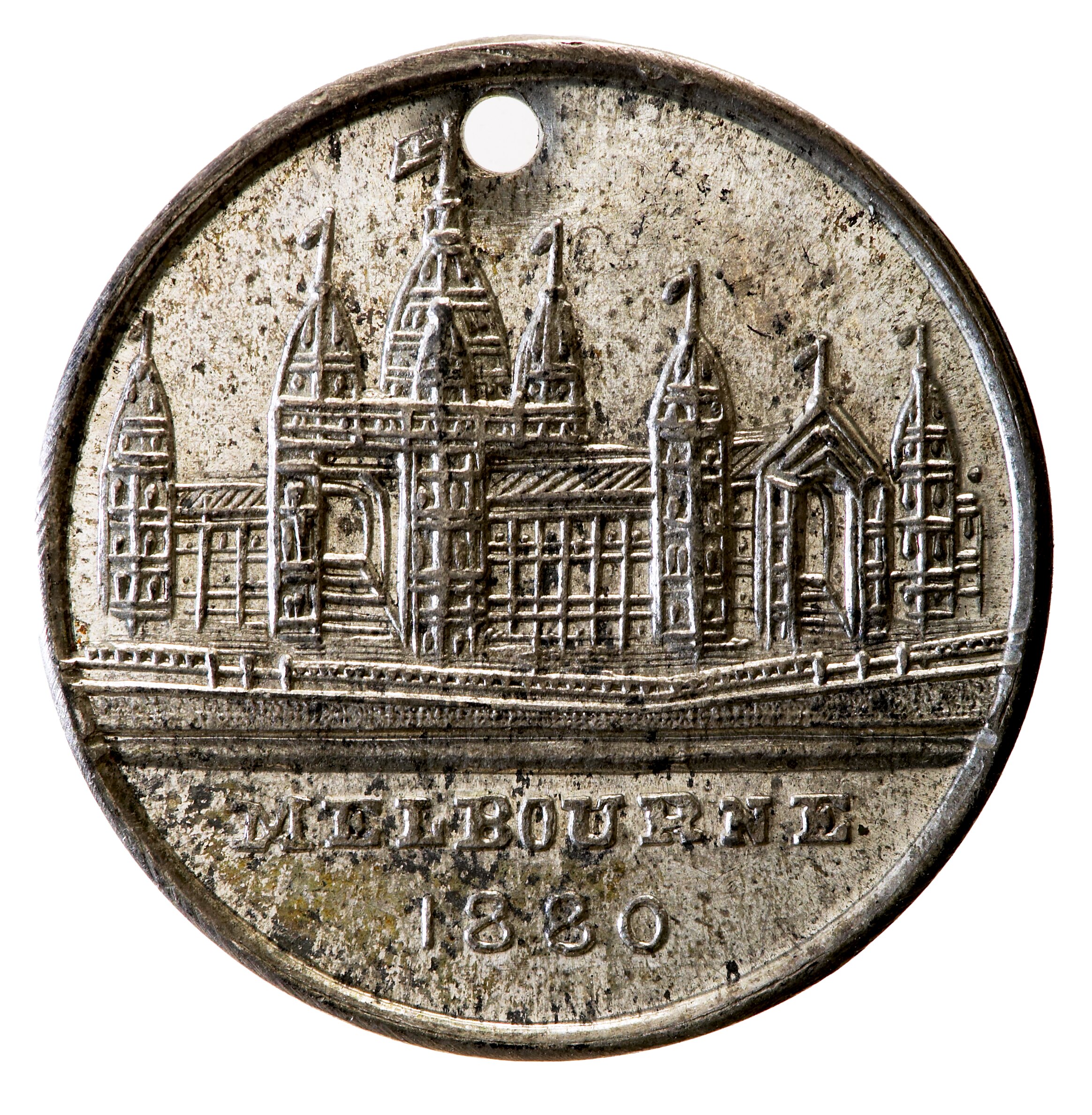 Aluminium commemorative medal from the International Exhbition, Melbourne 1880. This medal features view of the Exhibition Building from the south-east corner and a monogram MIE.