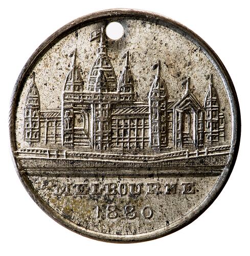 Other Details: This medal was struck for sale to visitors to the exhibition. It features view of the Exhibition Building from the south-east corner and a monogram MIE. The Melbourne International Exhibition ran from 1 October 1880 to 30 April 1881. The exhibition building that still stands was constructed for the occasion, designed by Joseph Reed and built by David Mitchell. Over 1.3 million people visited the exhibition at a time when Melbourne's population was only around 282,000.