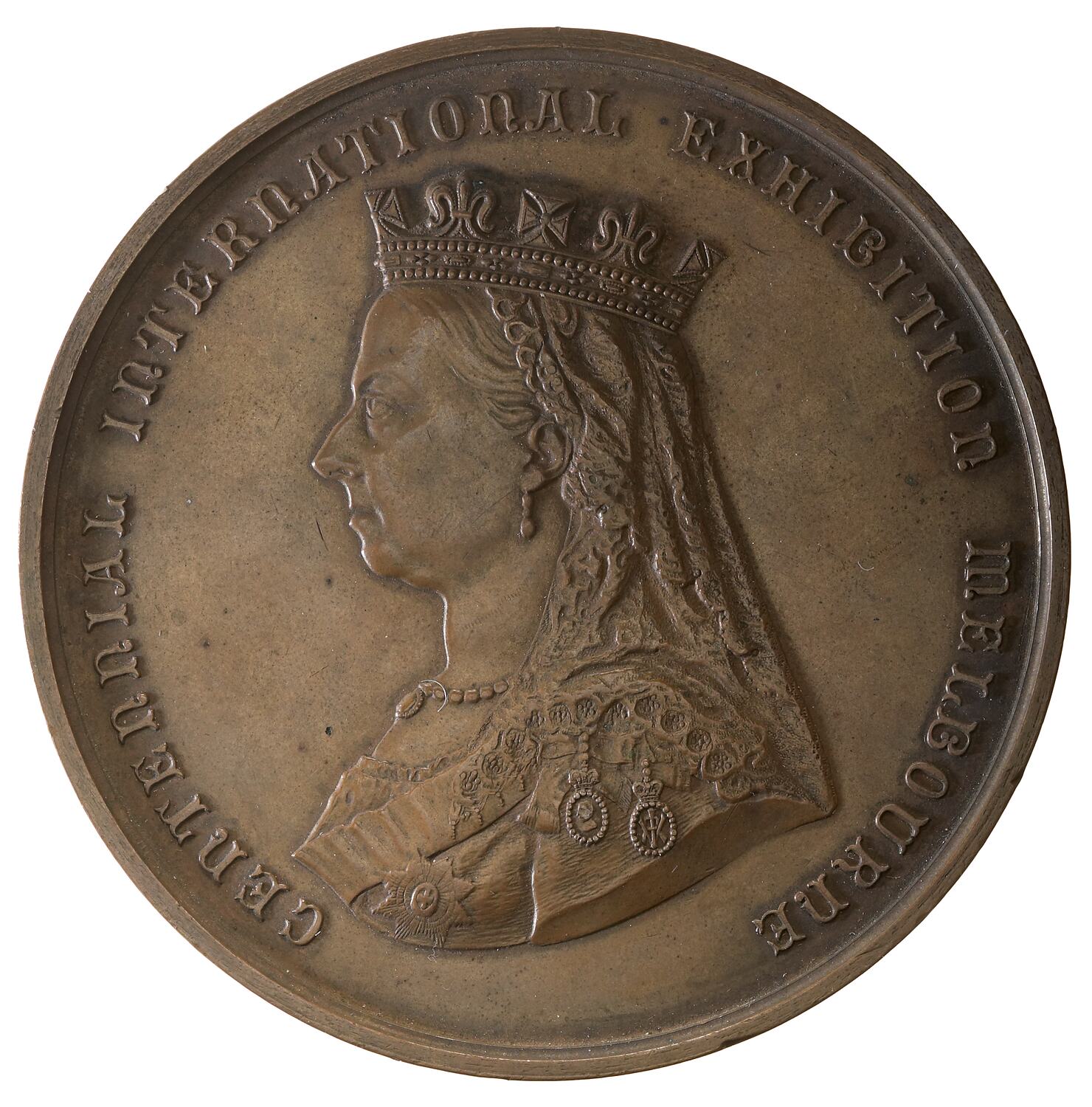 Bust of Queen Victoria facing left wearing crown and veil; around, CENTENNIAL INTERNATIONAL EXHIBITION MELBOURNE