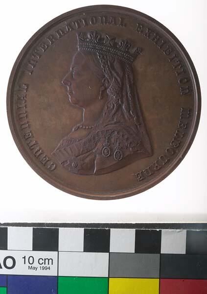 Bust of Queen Victoria facing left wearing crown and veil ; around, CENTENNIAL INTERNATIONAL EXHIBITION MELBOURNE