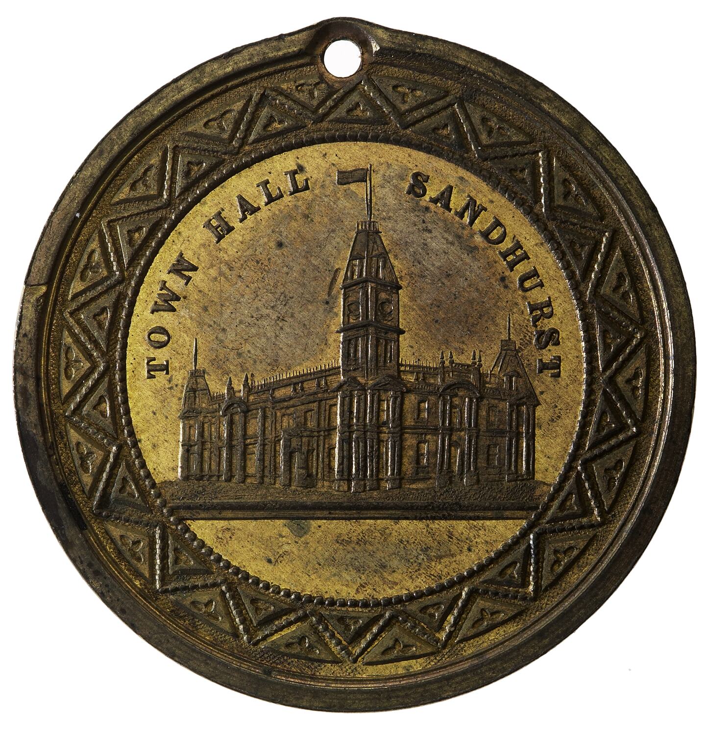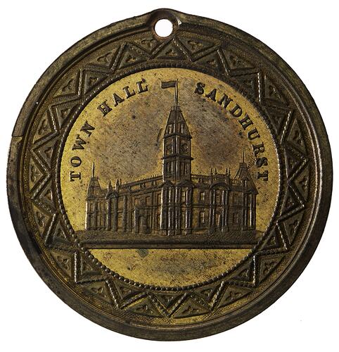 A gilt medal (31 mm diameter) featuring a view of the Bendigo (Sandhurst) Town Hall and commemorating the Bendigo Exhibition of 1886. It is holed and may have been sold with a ribbon and pin for wearing.