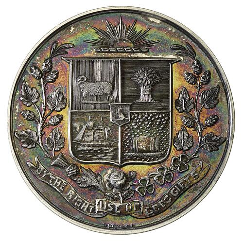 An unissued silver prize medal (35 mm diameter) featuring the Shield of Geelong with the motto THE RIGHT USE OF GOD'S GIFTS