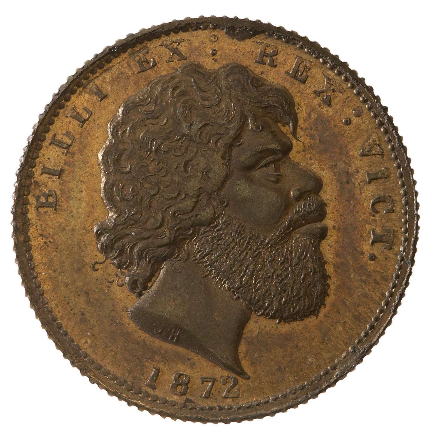 BILLI EX : REX : VICT./1872 Head of a bearded Aborigine facing right, Initials I.H under neck truncation.