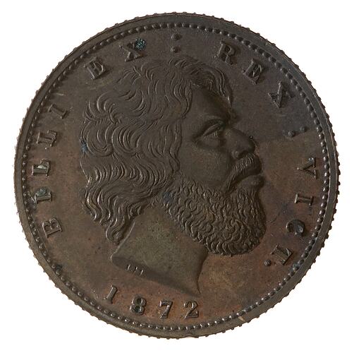 BILLI EX : REX : VICT. 1872 Head of a bearded Aborigine facing right, Initials I.H under neck truncation (obverse). STRUCK AT THE EXHIBITION MINT Coat of arms surrounded by a wreath (reverse).