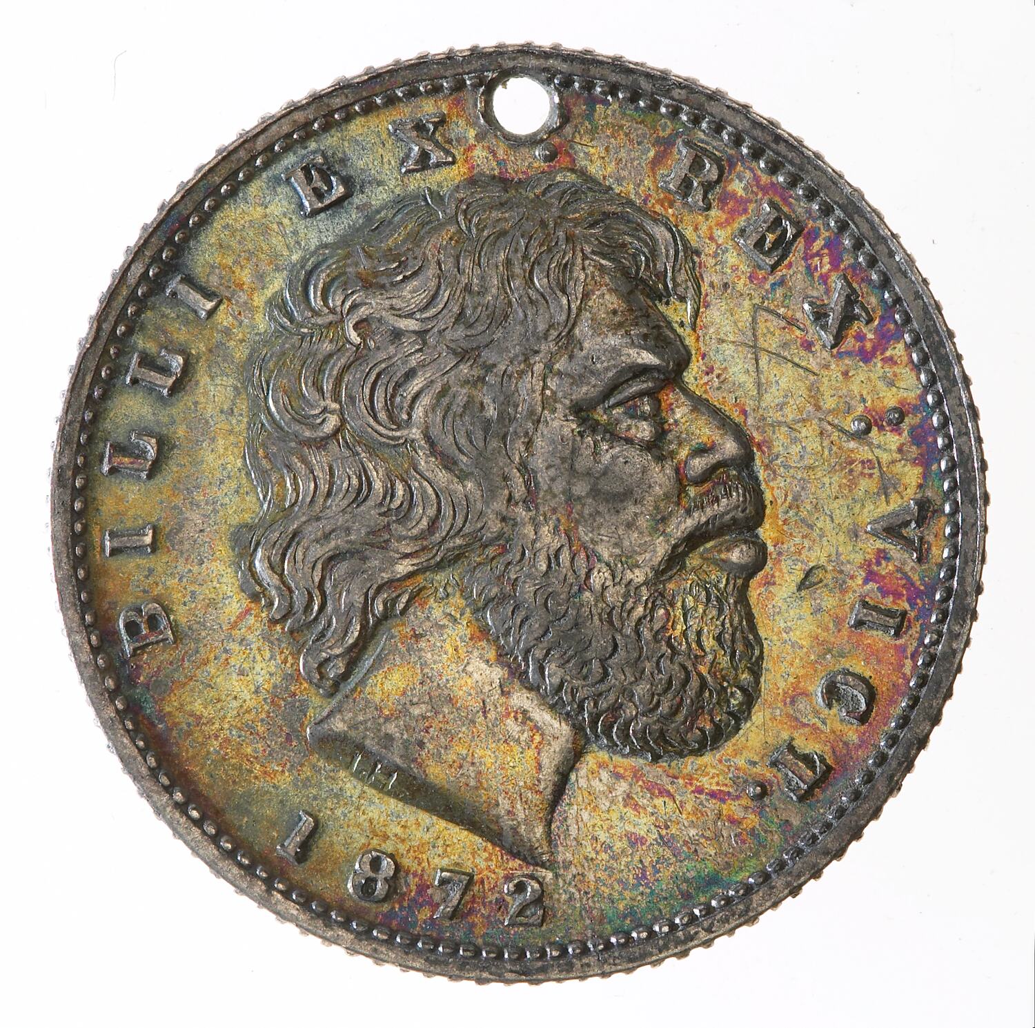 BILLI EX : REX : VICT./1872 Head of a bearded Aborigine facing right, Initials I.H under neck truncation.