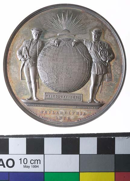 A large silver prize medal (69 mm diameter), not issued. It features a globe which shows the Pacific ocean; supporters on either side of the globe - Capt. James Cook, left, and Christopher Colombus right each dressed and carrying navigational instruments of their era; above, rising sun; the globe rests on a plinth with MELBOURNE. 1875 incuse; in the exergue: PHILADELPHIA /1876 / STOKES & MARTIN MELBOURNE; On exergue line: O.R.CAMPBELL.DES. J.HOGARTH. FEC