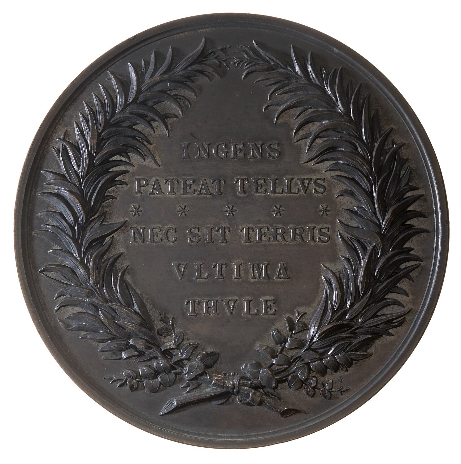 At centre, a globe which shows the Pacific ocean; supporters on either side of the globe - Capt. James Cook, left, and Christopher Colombus right each dressed in, and carrying navigational instruments of, their era; above, rising sun; the globe rests on a plinth with MELBOURNE. 1875 incuse; in the exergue: PHILADELPHIA /1876 / STOKES & MARTIN MELBOURNE; On exergue line the artist's names: O.R.CAMPBELL.DES. J.HOGARTH. FEC