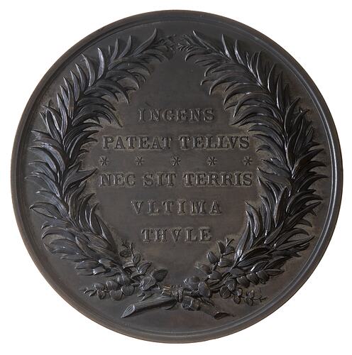 Obverse: MELBOURNE. 1875; In the exergue:PHILADELPHIA / 1876 / STOKES & MARTIN MELBOURNE; On exergue line: O.R.CAMPBELL.DES. J.HOGARTH. FEC Reverse: INGENS / PATEAT TELLVS / * * * * * / NEC SIT TERRIS / VLTIMA / THVLE and the artist's initialsT.S. at the junction of the wreath. Edge: THE MELBOURNE MEAT PRESERVING CO.
