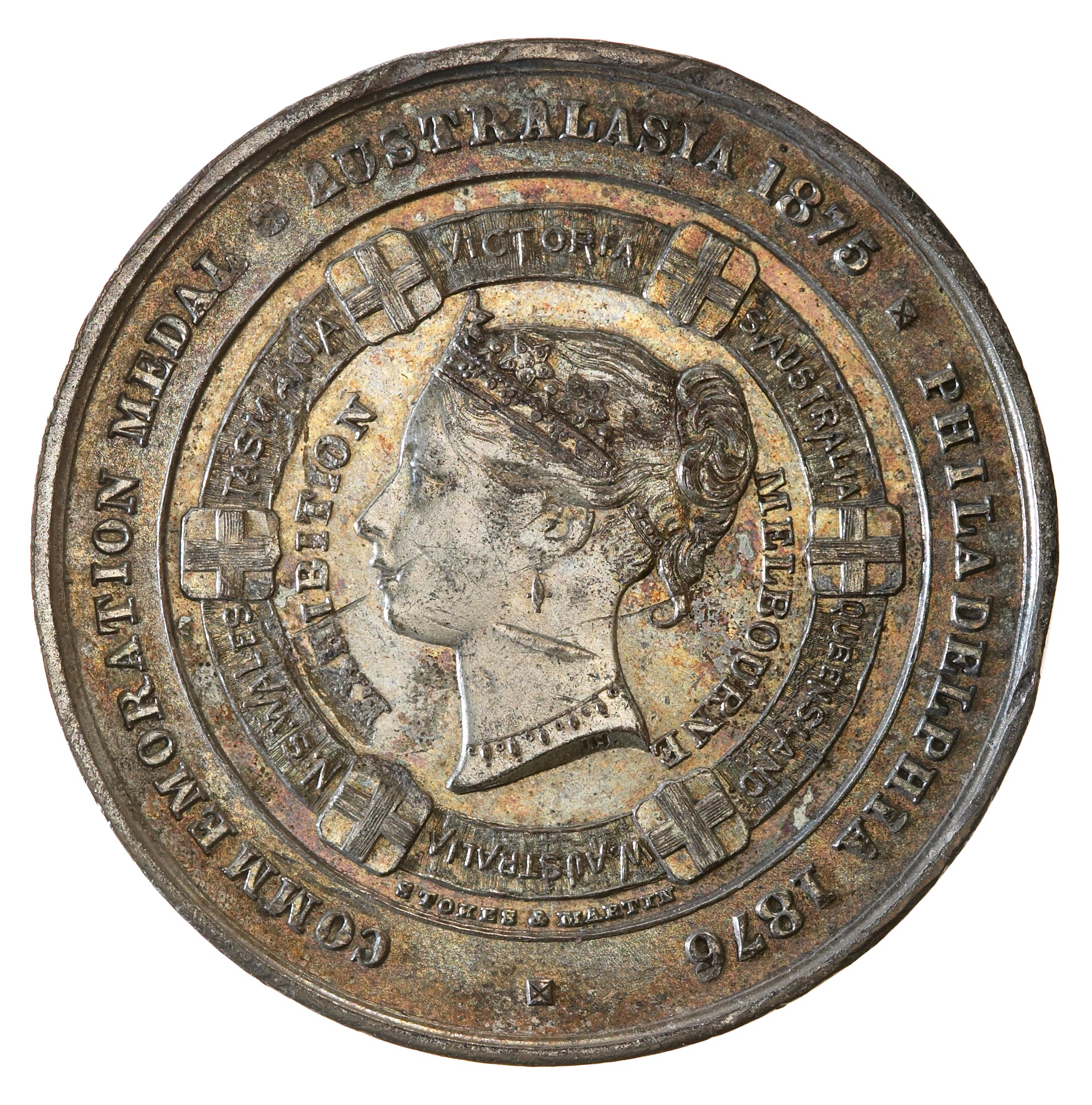 Obverse: COMMEMORATION MEDAL . AUSTRALASIA 1875 . PHILADELPHIA 1876 ./ EXHIBITION MELBOURNE/STOKES & MARTIN; I.H. incuse on truncation Reverse: In exergue: STOKES AND MARTIN / MELBOURNE ; Above exergue line J.H.