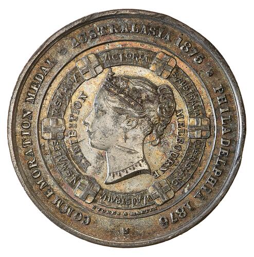 At centre within a ring divided by six shields, head on Queen Victoria facing left wearing coronet and pearl necklace, around, EXHIBITION MELBOURNE; on ring between shields, VICTORIA S.AUSTRALIA QUEENSLAND W.AUSTRALIA N.S.WALES TASMANIA; around on brioad rim, COMMEMORATION MEDAL + AUSTRALASIA 1875 + PHILADELPHIA 1876 + ; makers name STOKES & MARTIN in tiny letters between ring and broad rim at 06; I.H. incuse on truncation.