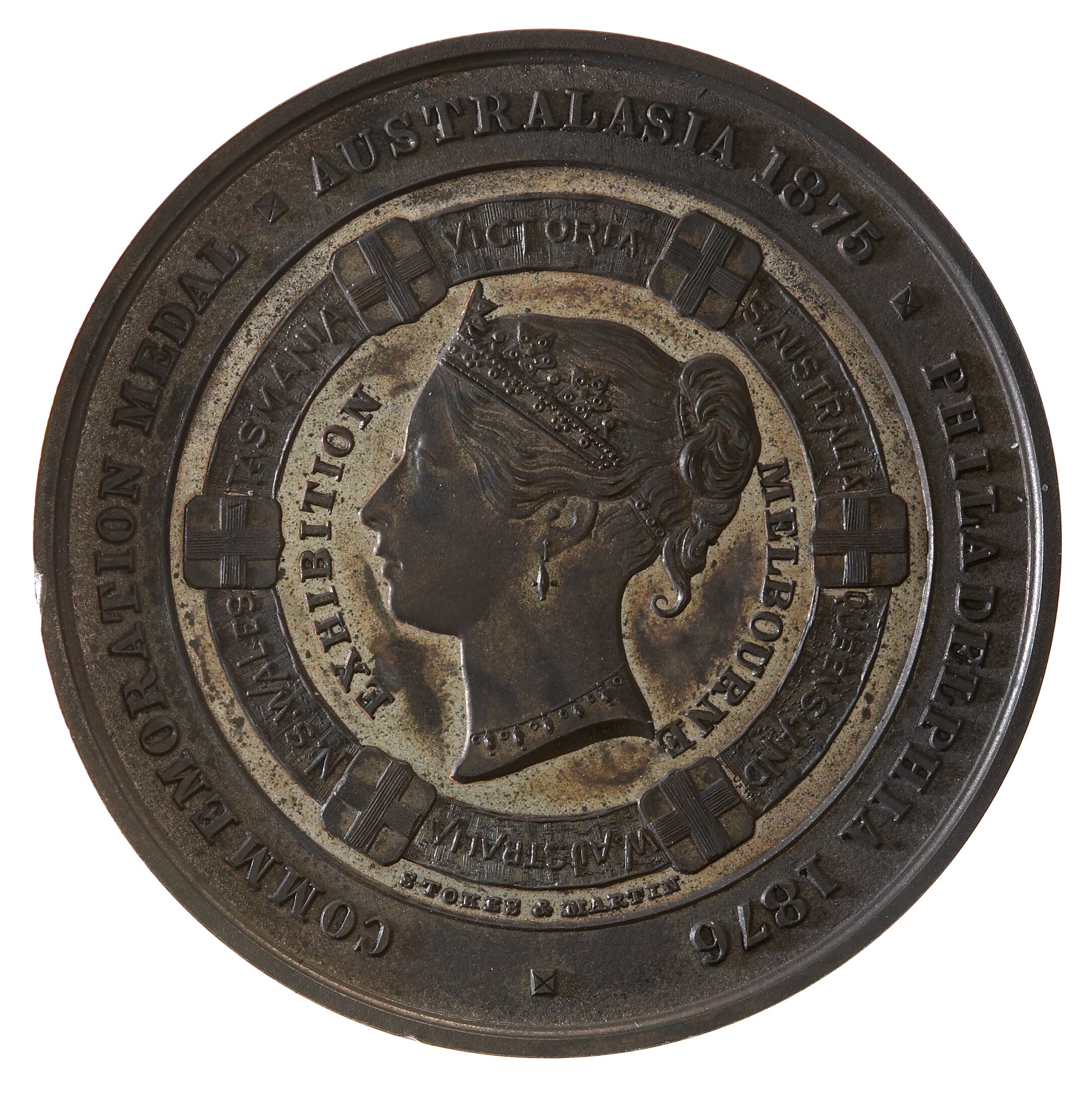 Obverse: COMMEMORATION MEDAL . AUSTRALASIA 1875 . PHILADELPHIA 1876 ./ EXHIBITION MELBOURNE/STOKES & MARTIN; I.H. incuse on truncation Reverse: In exergue: STOKES AND MARTIN / MELBOURNE ; Above exergue line J.H.