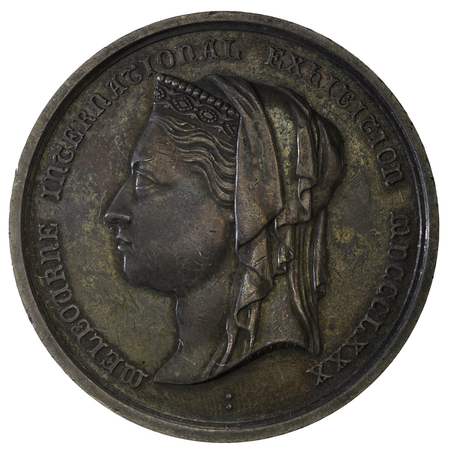 Head of Queen Victoria, wearing small crown and veil left; around, MELBOURNE INTERNATIONAL EXHIBITION MDCCCLXXX .