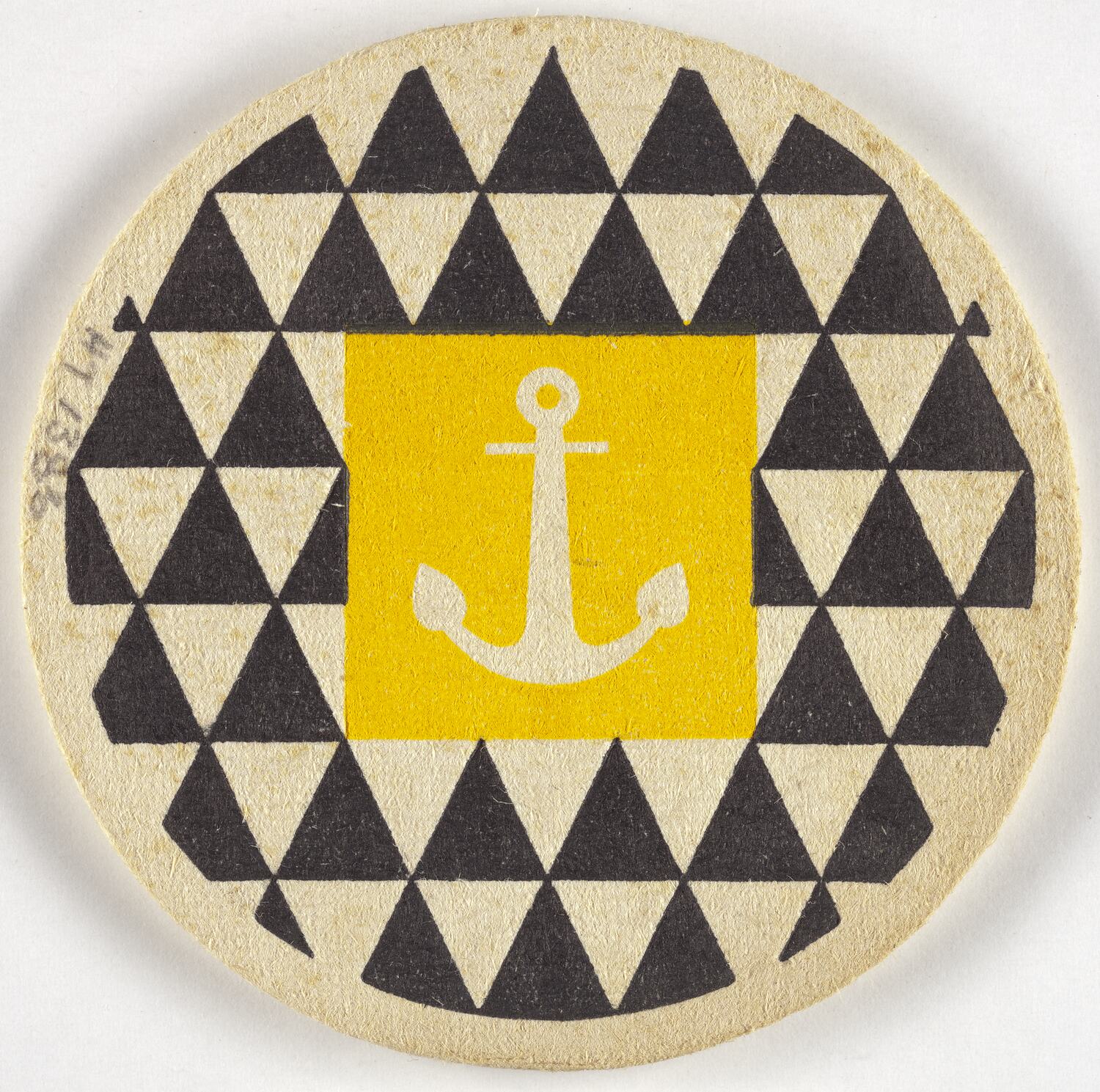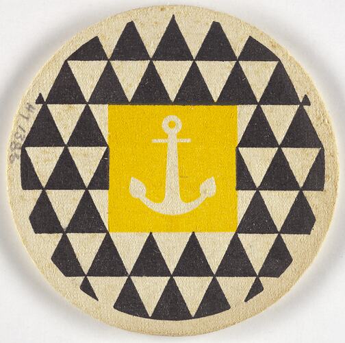 Round card coaster, cream coloured and inscribed on one side with brown decoration. White anchor on yellow background on reverse of coaster.
