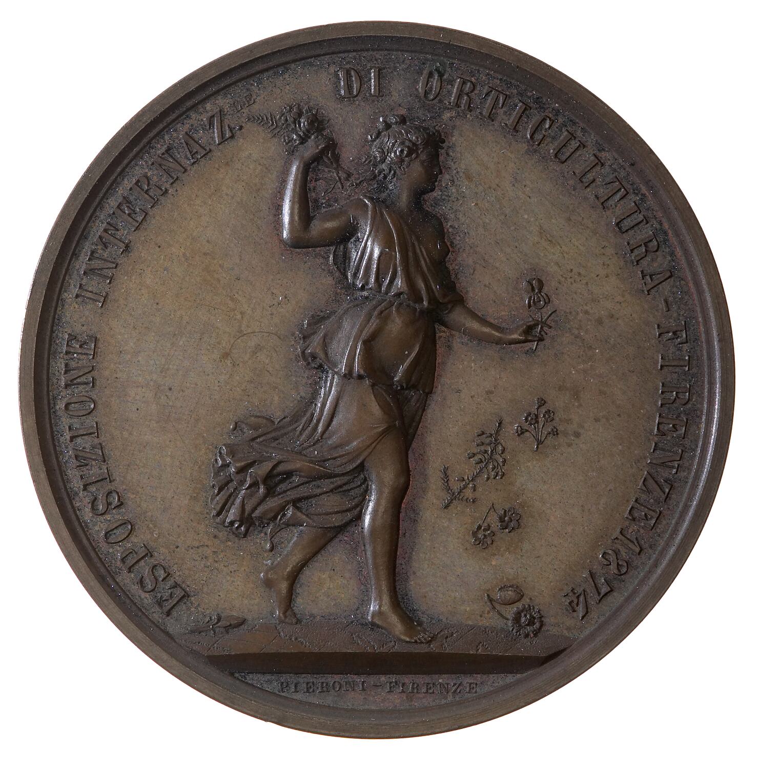 Horticulture running right distributing flowers; around, ESPOSIZIONE INTERNAZ. DI ORTICULTURA FIRENZE 1874 in exergue, PIERONI - FIRENZE