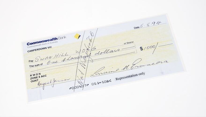 The success of the Glenormiston Gathering (1994) made possible a cheque of $1,000 to be handed on to succeeding organising committees as seeding money. This facsimile cheque was created in 2003 for the Women on Farms Gathering display of icons at the Yarram Gathering; this display was prepared on the occasion of the signing of a partnership agreement between Museum Victoria and the Victorian Women on Farms Gathering community.