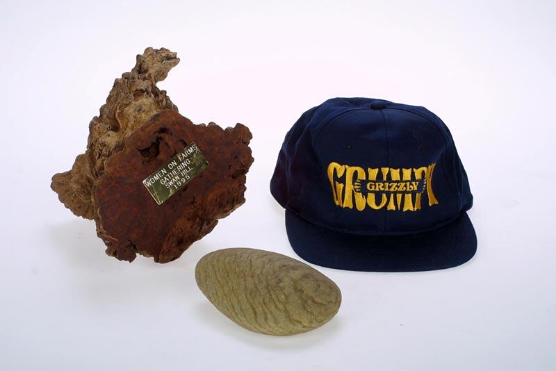 The stone was one of three icons selected for the Swan Hill Gathering. The stone directly references the "stone soup" story and symbolises the nutrition and strength which pulls women together. The other two accompanying icons include a mallee root and a peak cap. These icons were chosen as symbols of the ability of rural women to come together, survive and grow after periods of great hardship. Whether it is fire, interest rates, crashing markets, or the death or injury of a family member, it is often the women that pull out the extra energy to bind the wounds of soul, soil and family. The mallee root is tough, resilient, drought resistant and beautiful - 'like us Murray Mallee women'. The "Grumpy" cap indicates the 'forming, storming, norming then performing' process of creating a Gathering.