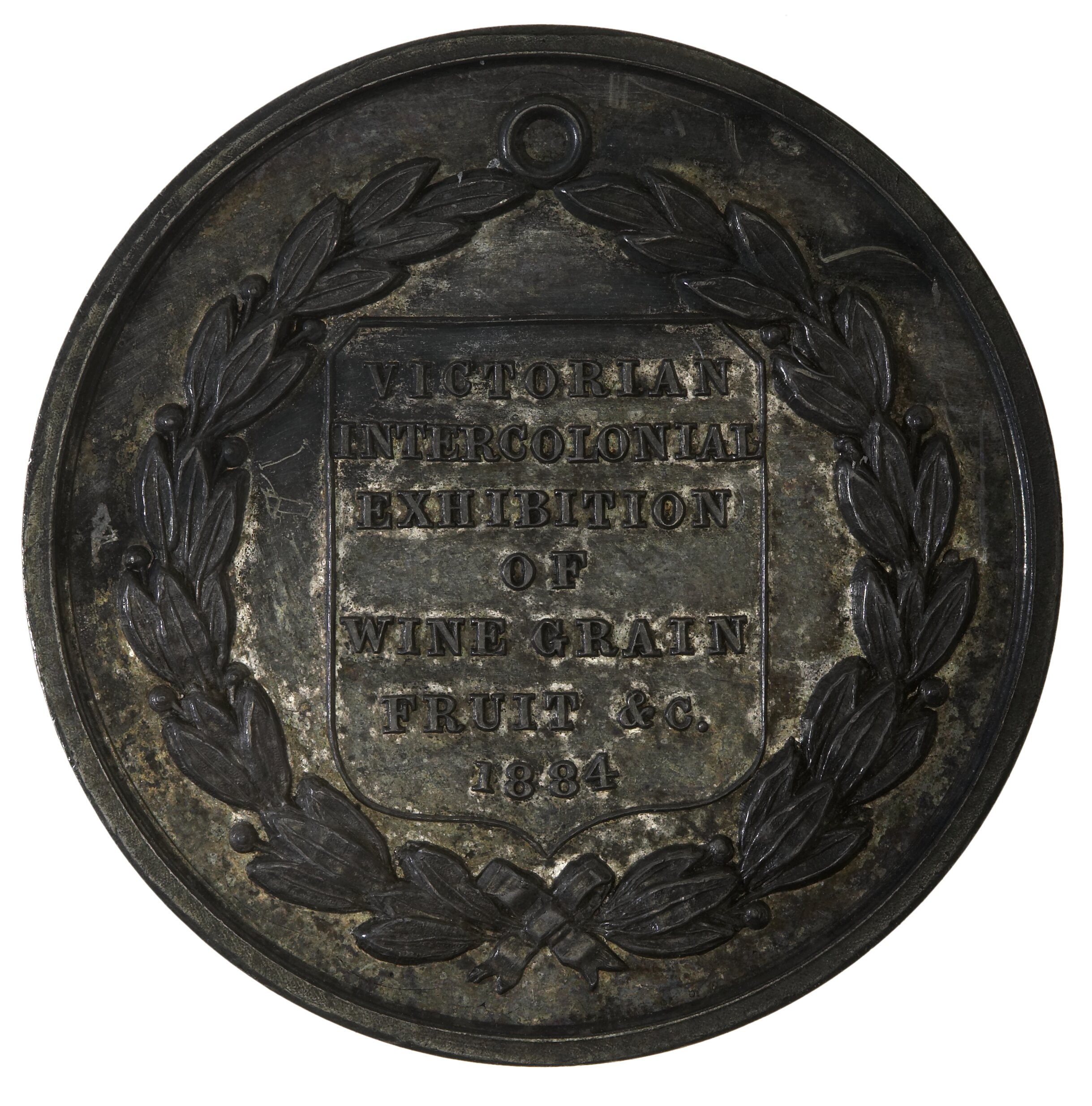 Obverse: VICTORIAN INTERCOLONIAL EXHIBITION OF WINE GRAIN FRUIT &c 1884 Reverse: M.M.R. LEWELLIN OIL PAINTING