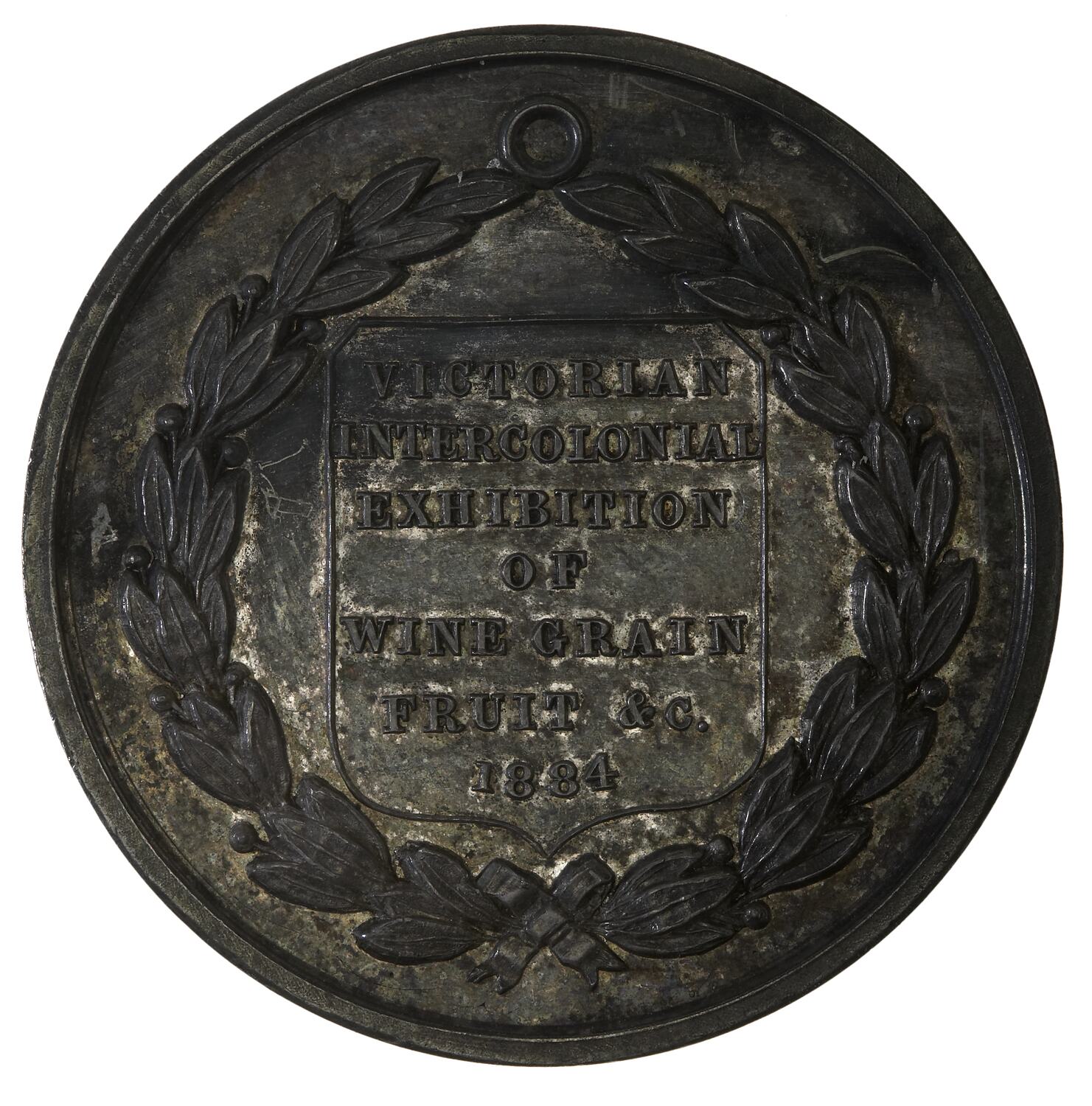 Within an olive wreath, VICTORIAN / INTERCOLONIAL / EXHIBITION / OF WINE GRAIN / FRUIT &c / 1884