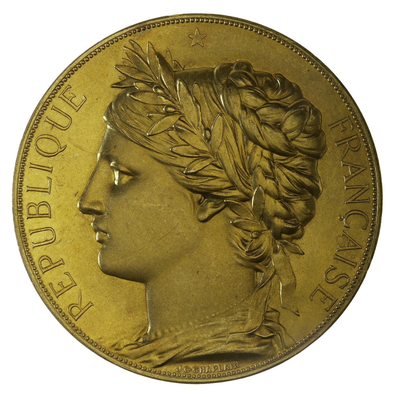A large gold medal, 50 mm diameter)featuring a laureate bust of France and Victory flying above the Exhibition grounds with trumpet and wreath; the winner's name is carried above its head by a young winged figure.