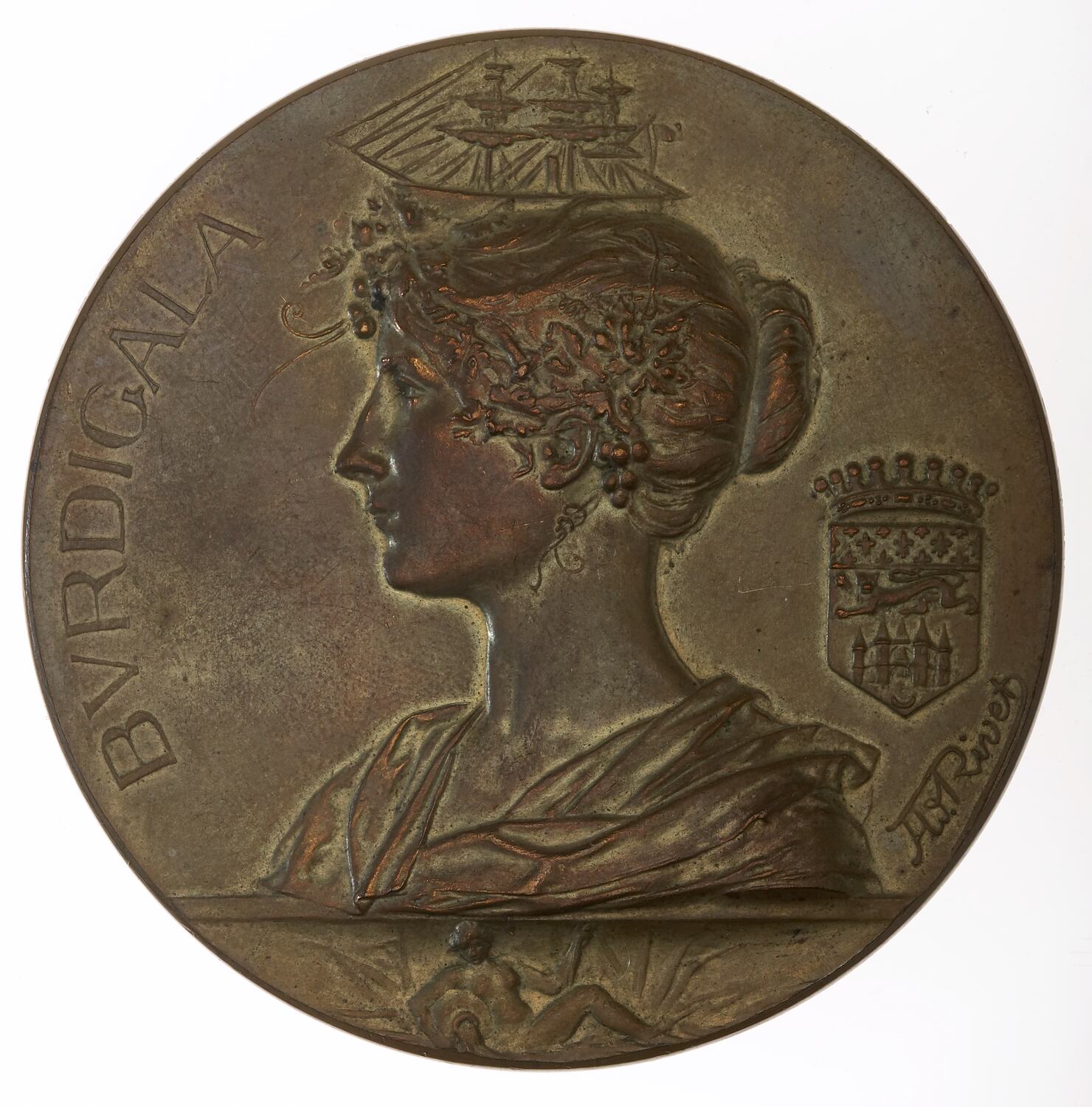 Bust of Bordeaux (given her Latin name Burdigala) wearing a wreath of grape vine and bearing a ship, powered by both steam and sail, on her head, at right, coat of arms above artist's name A Rivet; on left, BVRDIGALA