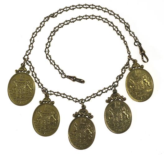 Gold twisted cable chain with lobster clasp at each end, chain loop openings are sealed with C shaped covers.The number '9' on a small square soldered to the last link at one end of the chain. The five medals are uniform in design with oval face depicting Bendigo Coat of Arms including horse and bull as supporters of the shield, above which is a speared snake, crown and flag flying the Southern Cross; underneath is a ribbon with inscription "PROGRESS". Medal is topped with decorative suspension loop attached to chain via split ring.