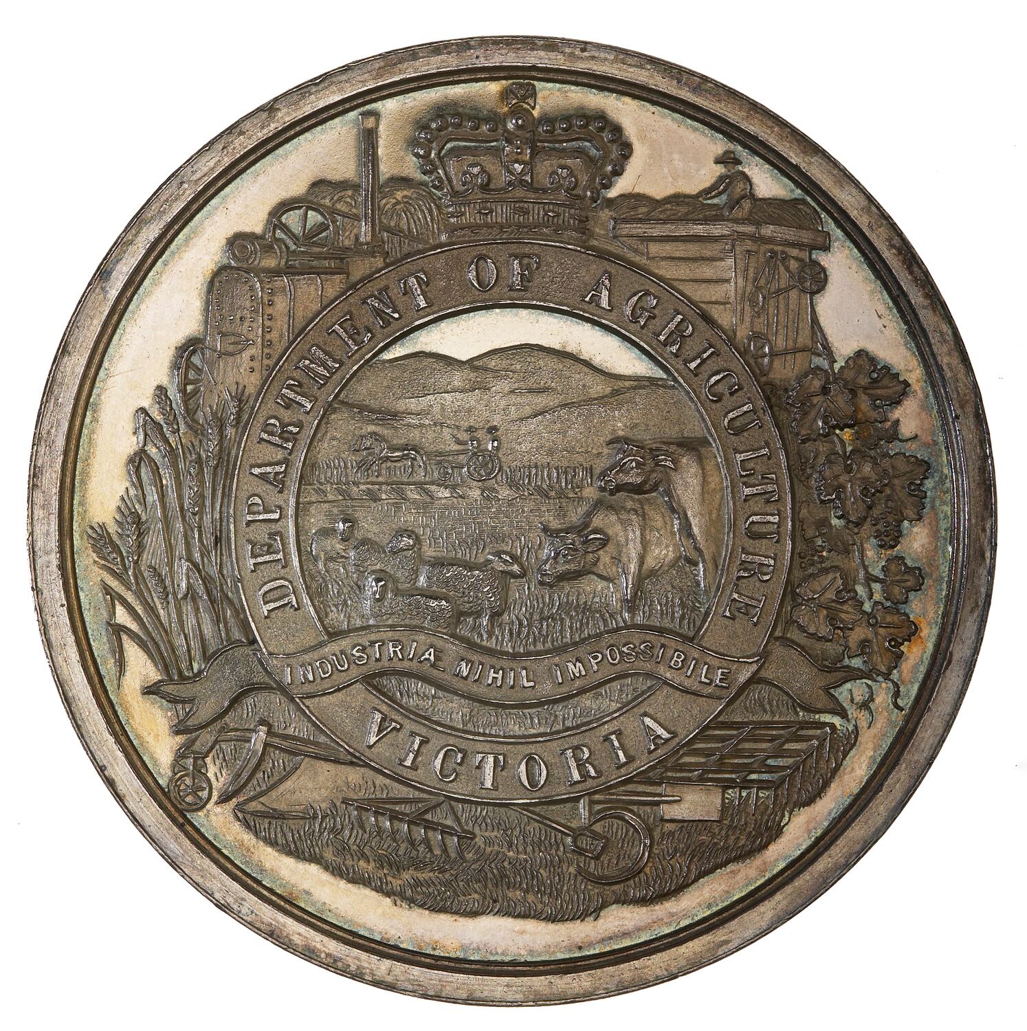 Rural scene of cows and sheep with a farmer and his wife driving a two-horse four-wheeled vehicle in the background, with the motto INDUSTRIA NIHIL IMPOSSIBILE (with work nothing is impossible) on ribbon; all surrounded by DEPARTMENT OF AGRICULTURE VICTORIA and farm machinery, wheat and grape vines.