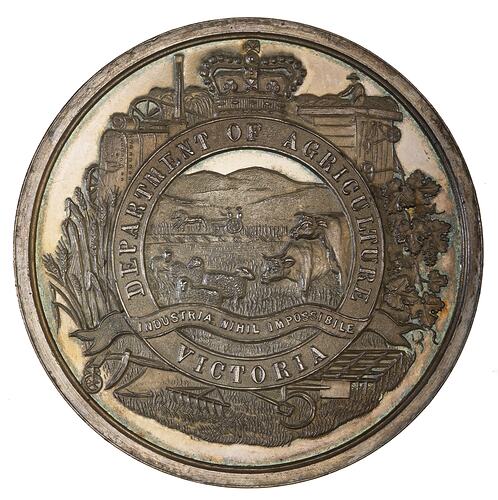 A silver medal (47 mm diameter) produced by the Department of Agriculture, Victoria as a generic prize medal, this example used for the Warrnambool exhibition of 1896-97 and won by Hans Irvine for Red Wine. It features a rural scene of cows and sheep with a farmer and his wife driving a two-horse, four-wheeled vehicle in the background with the motto INDUSTRIA NIHIL IMPOSSIBILE (with work nothing is impossible) all surrounded by farm machinery, wheat and grape vines.