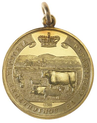 A gold prize medal (15 ct., 31 mm diameter with loop and ring) with the obverse of the Department of Agriculture of Victoria featuring a rural scene with horse, sheep, cow and pig in the foreground and farmer reaping wheat in the background; combined with the Royal Agricultural Society of Victoria Champion Prize of Australia reverse.