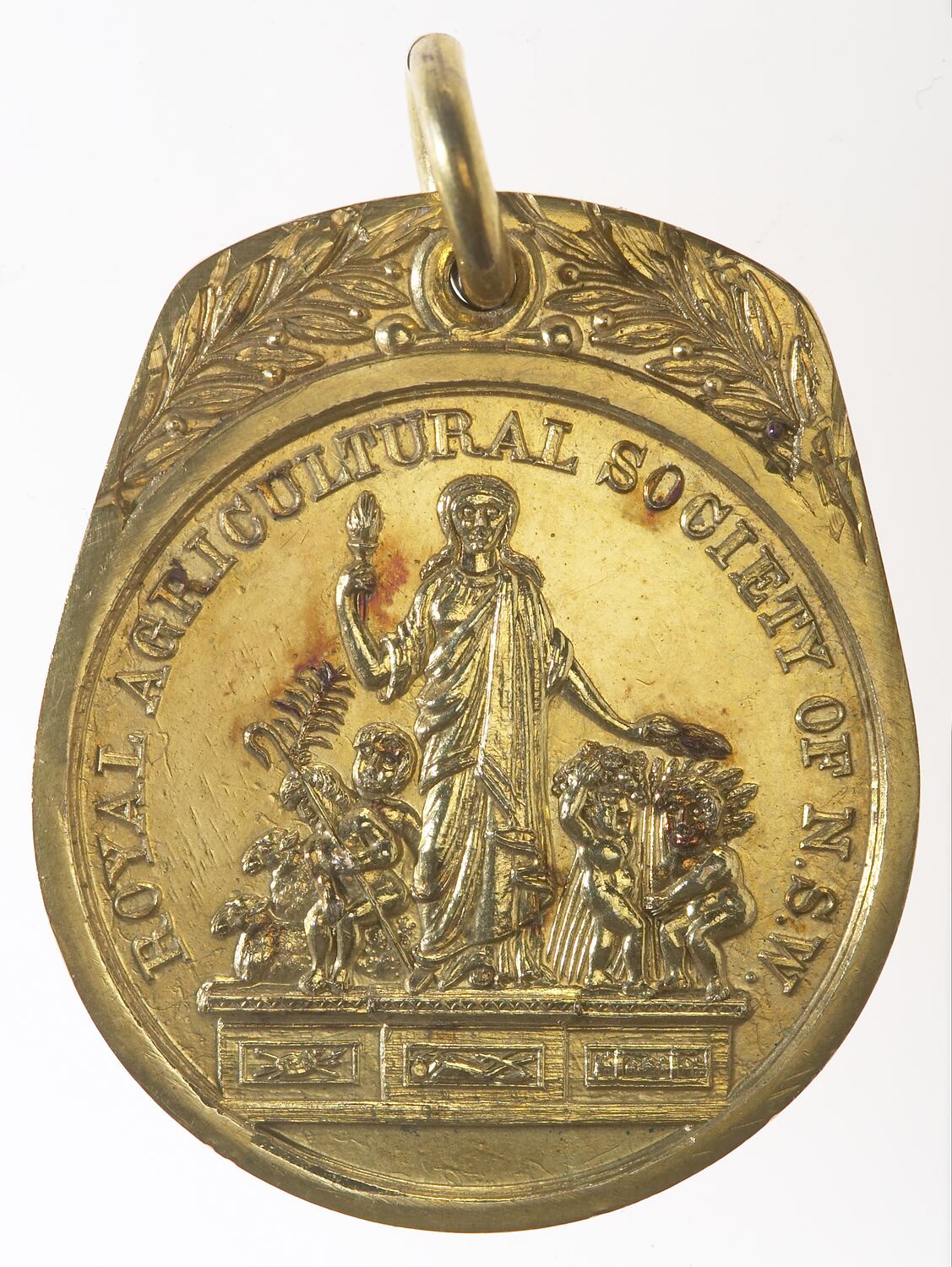 A gold medal (25 * 35 mm including loop) of the Royal Agricultural Society of New South Wales awarded to Hans Irvine as Champion Prize for a red wine in 1903. It features New South Wales holding a burning torch and Victors wreath standing on a platform and surrounded by the four Seasons as children undertaking agricultural tasks. The top of the medal is an extended loop made to represent the top of an olive wreath, it is holed and has a gold loop through it.