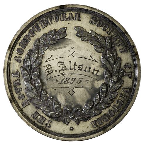 At centre inscribed within an olive wreath, D. Alston / 1895 around, THE ROYAL AGRICULTURAL SOCIETY OF VICTORIA