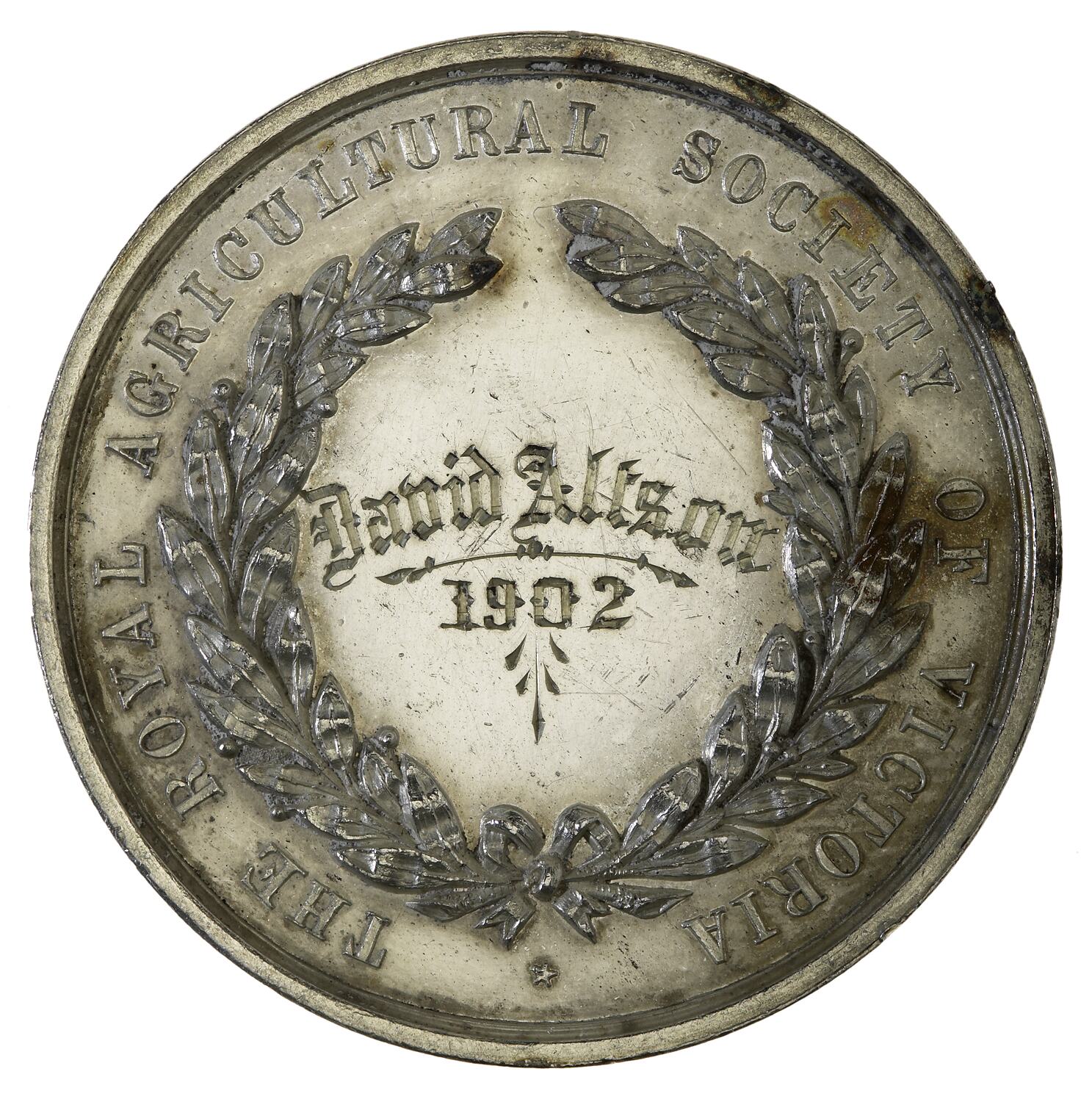 At centre inscribed within an olive wreath, David Alston / 1902 around, THE ROYAL AGRICULTURAL SOCIETY OF VICTORIA