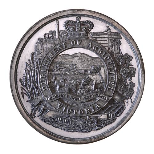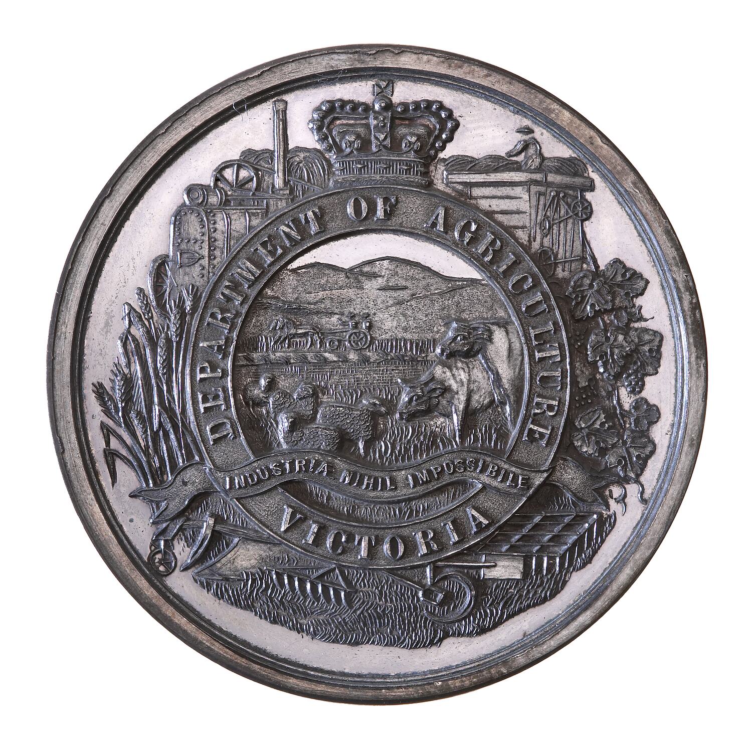 At centre surmounted by crown an agricultural scene with horse, sheep, cow and pig in the foreground, and farmer and wife driving two horse buggy in the background; around, DEPARTMENT OF AGRICULTURE VICTORIA and the motto INDUSTRIAE NIHIL IMPOSSIBILE (with work nothing is impossible) on ribbon.