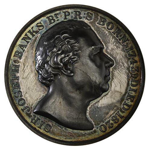 Bare head right; around, SIR JOSEPH BANKS BT PRS BORN 1745 DIED 1820