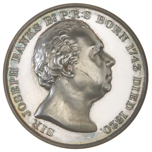 Bare head right; around, SIR JOSEPH BANKS BT PRS BORN 1745 DIED 1820