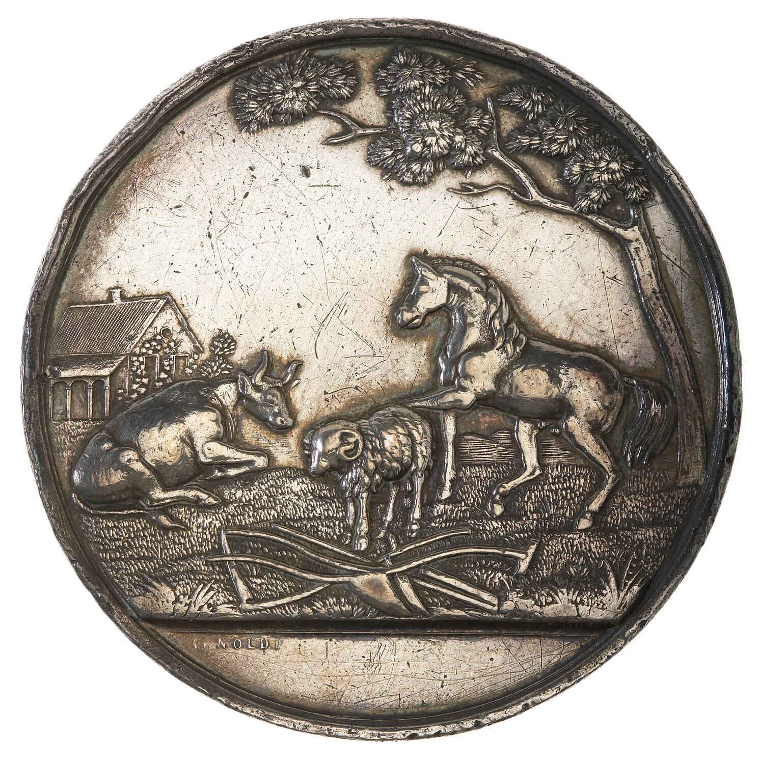A silver prize medal (51 mm. diameter) featuring a rural scene of farm house, reclining cow, sheep, horse and tools below gum tree branch; in exergue in tiny letters, ARNOLDI and details of the prize engraved within open wreath below small Kangaroo