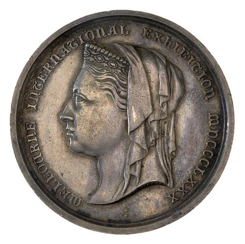 Head of Queen Victoria, wearing small crown and veil left; around, MELBOURNE INTERNATIONAL EXHIBITION MDCCCLXXX .