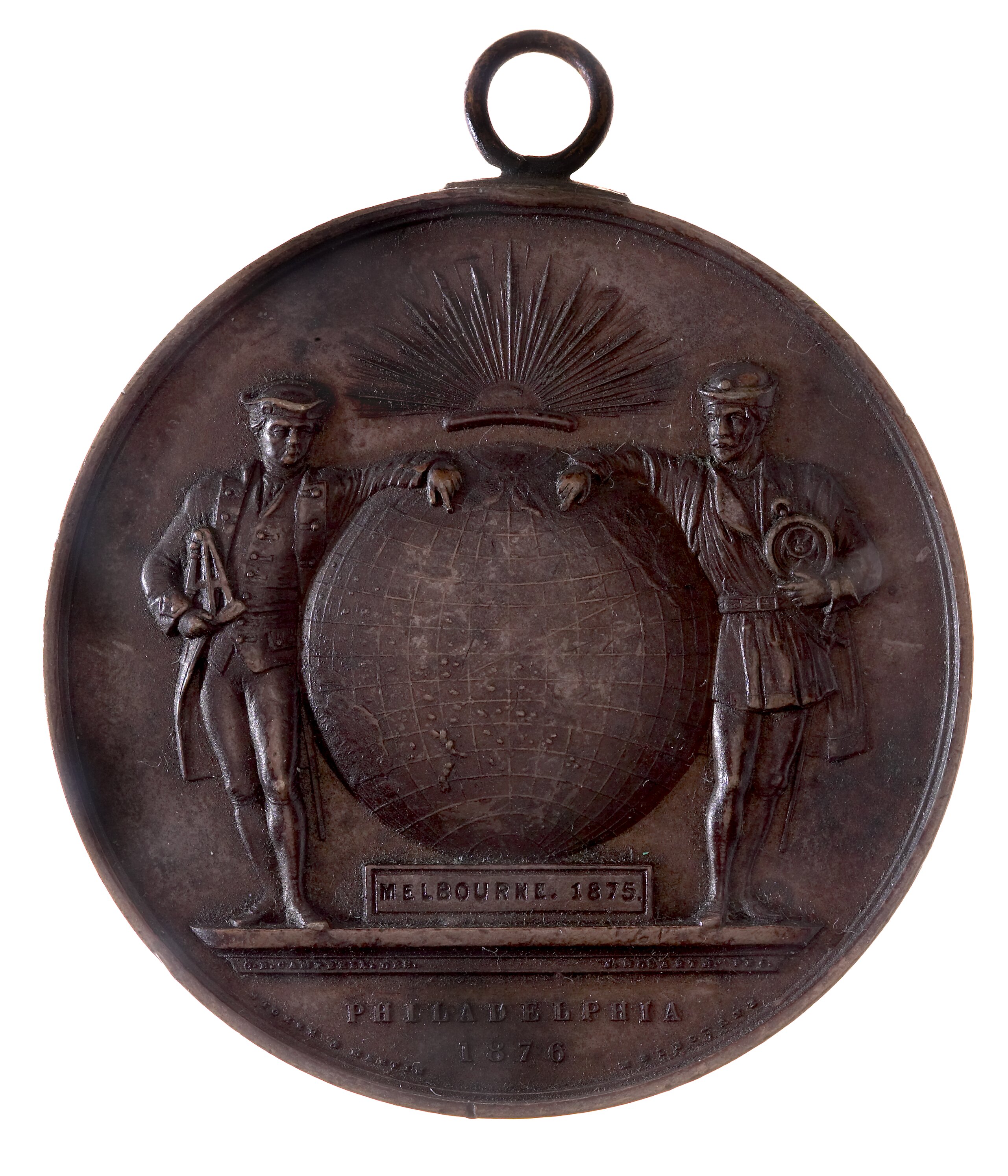 Other Details: Medal minted for the Victorian Intercolonial Exhibition, 1875 to select Victorian entries for the Centennial Exhibition in Philadelphia, 1876. The Exhibition was opened in Melbourne in September 1875 and closed in November of the same year. Winning exhibits were sent to Philadelphia for display in its Centennial Exhibition, which opened on 10 May 1876. This medal was designed by Oswald Rose Campbell, engraved by Julius Hogarth and struck by Stokes and Martin.