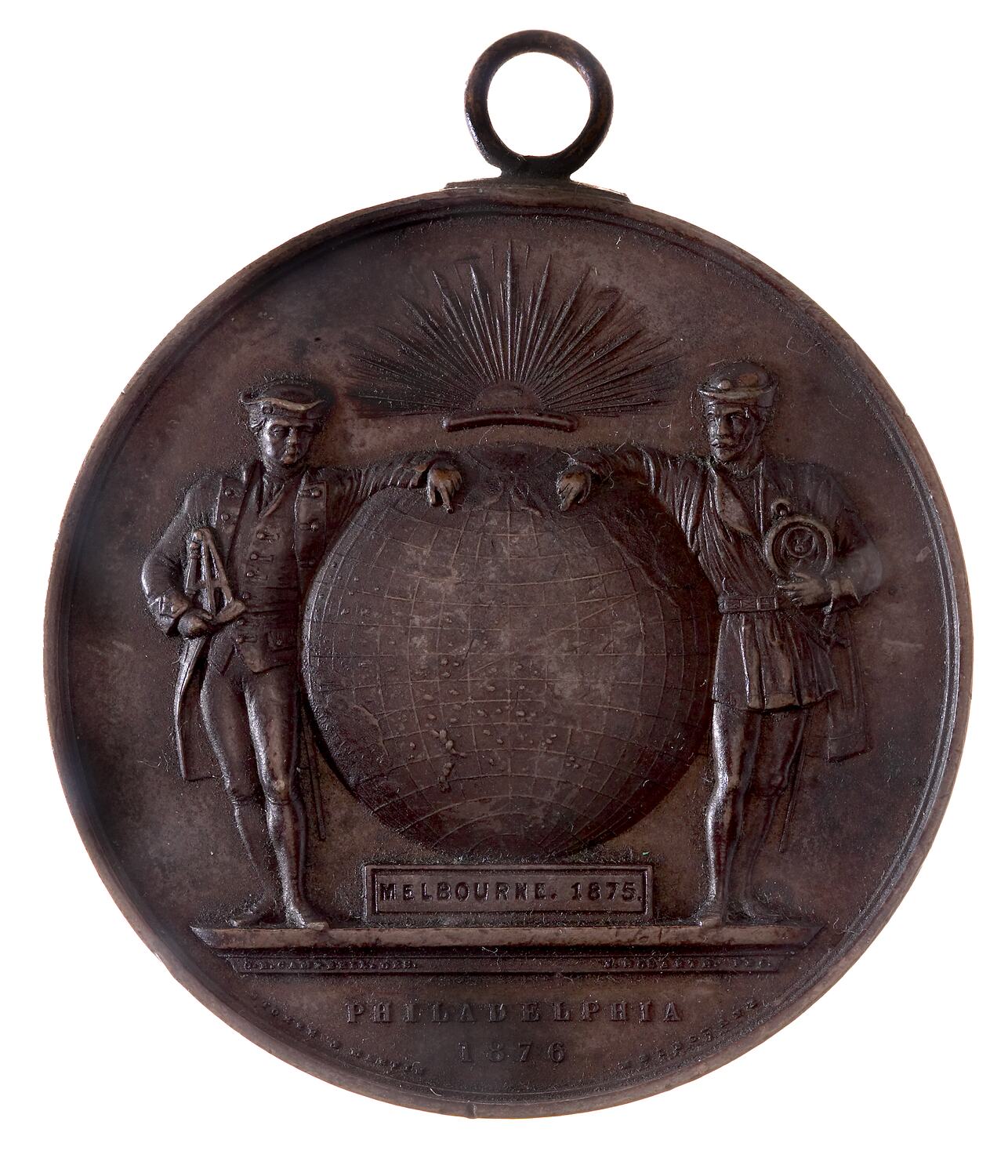 Edge Impressed: MESSRS T & [......]KEN Obverse: MELBOURNE 1875 PHILADELPHIA 1876 and in tiny letters, STOKES & MARTIN MELBOURNE O.R. CAMPBELL. DES. J. HOGARTH. FEC. Reverse: INGENS / PATEAT TELLVS / NEC SIT TERRIS / VLTIMA / THVLE