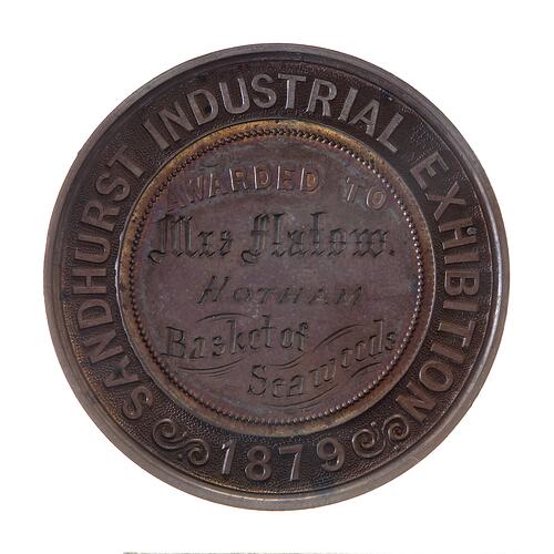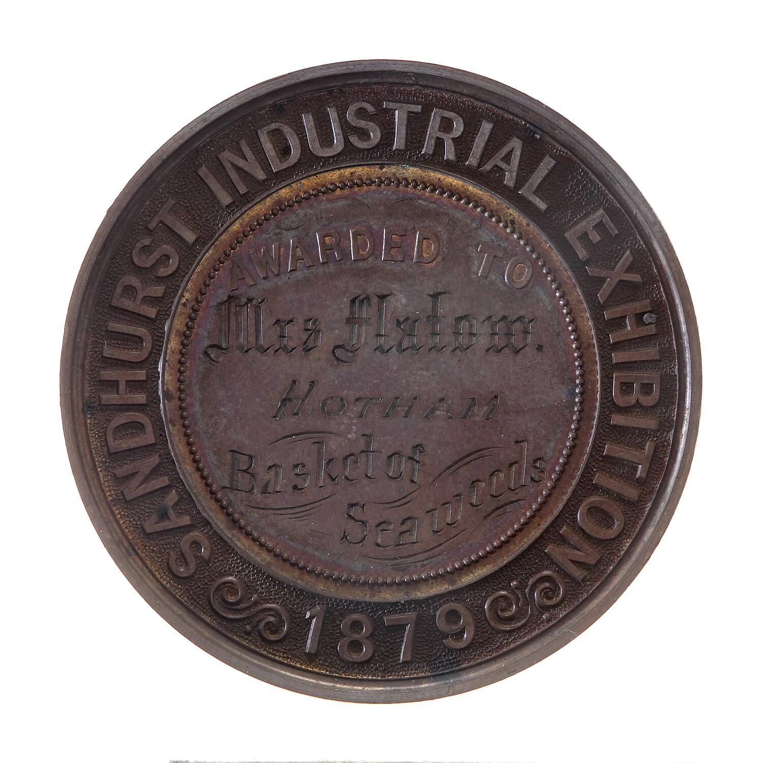 Other Details: This bronze prize medal was awarded to Mrs. J. V. Flatow for her 'Basket of Seaweeds' at the Sandhurst Industrial Exhibition in 1879. Mrs Flatow won a series of exhibition medals for decorative pieces featuring seaweeds and shells in the period 1879 to 1888.