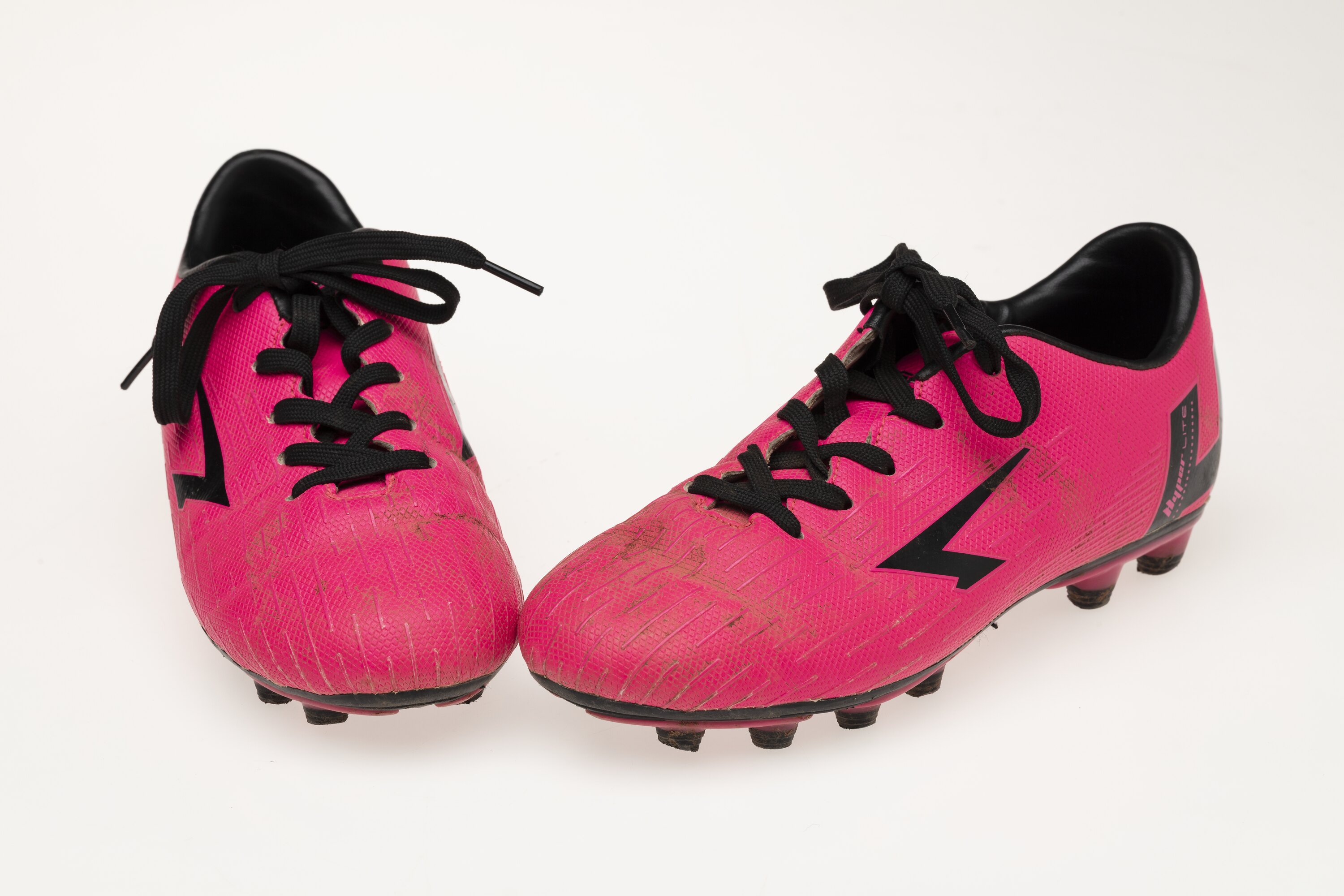 Pair of pink Australian Rules football boots with black laces which belonged to Layla Murphy and worn by her in her early football matches in and around Swan Hill, 2021-23. Layla also wore these boots at an Aus Kick session at Marvel Stadium on 15 May 2021 and she finally stopped wearing them in 2023 when she grew out of them. Layla purchased the boots with her father at Sportspower in Swan Hill along with a clear mouthguard.