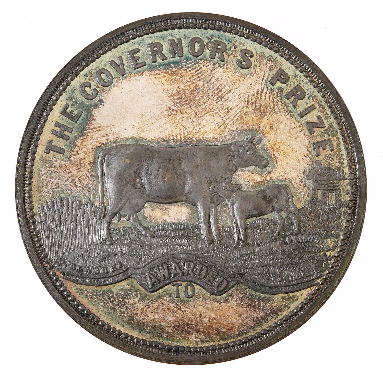 Cow with calf in field, farmhouse on right, wheat on left; above, THE GOVERNOR'S PRIZE; below AWARDED / TO (space in exurgue to engrave winner's name and date); in small letters above the exergue, P. BLASHKI & SONS
