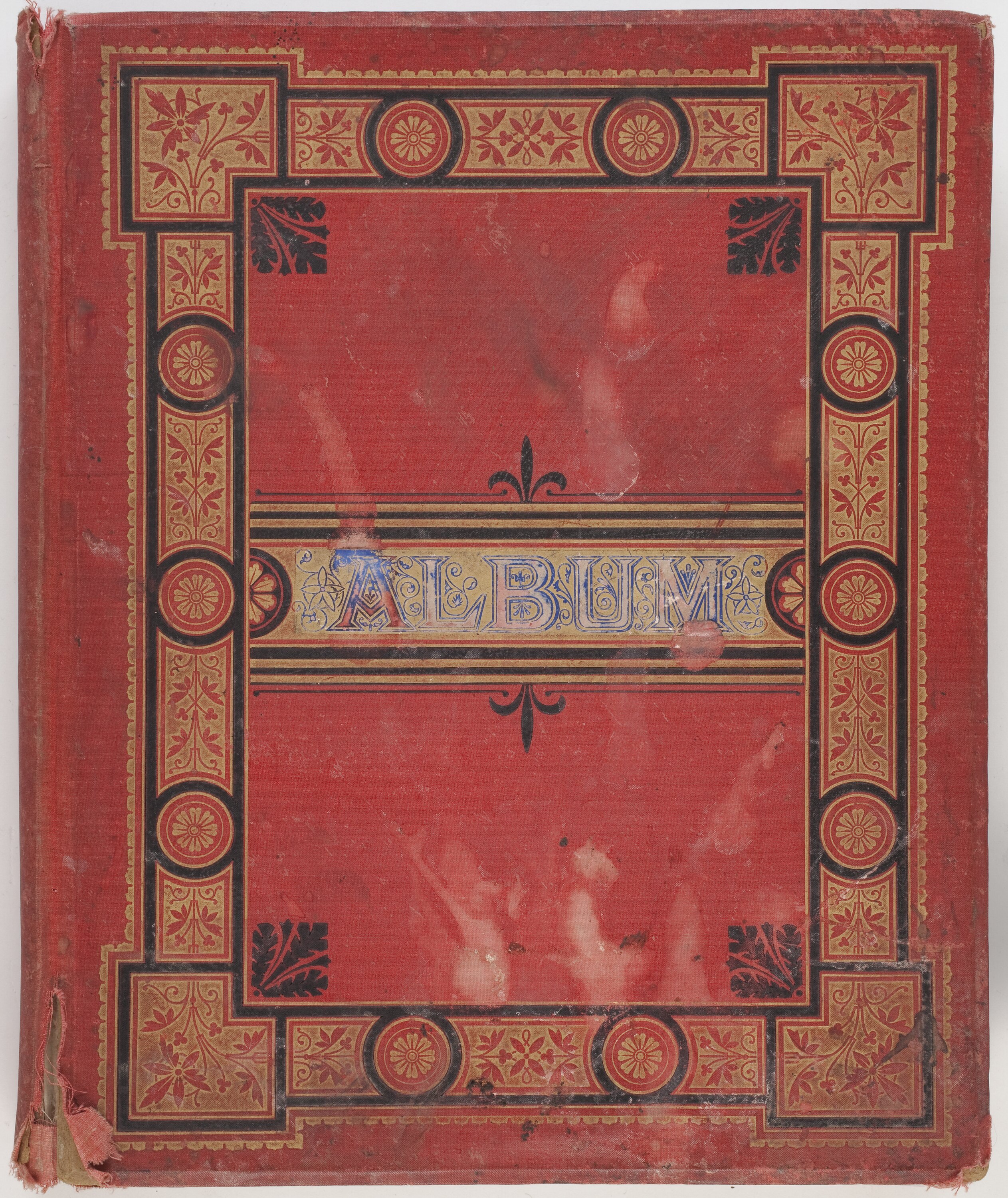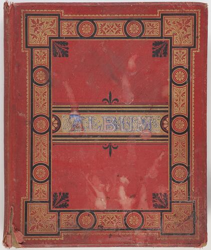 Large photograph album, covered in red material, containing a range of black and white photographs of the Melbourne Exhibition Building during the 1880 Melbourne International Exhibition, together with a collection of views of England and Gibraltar taken by Francis Frith and Company. The front cover had a black, gold and red floral border, with the word 'Album' across the centre. The photographs are not titled in the album, but the curator's descriptions are: exterior view from south, near a path near Rathdowne Street exterior view from south, across lake with reflection Art Court with paintings, statuary and chairs Close up of statuary and art work, same Art Court exterior view, Nicholson Street garden, showing a fountain in the middle of garden beds exterior view, from Nicholson Street, showing French flags and a sculpture of a hunter with gun and two dogs larger interior view of an Art Court view of crockery display in Main Hall, including display by Thomas Webb and Sons; large art works on display on the balcony view of the German section with flags large view: Art Court in annexe with bunting view of wool display in Main Hall German display on balcony, with curtains; showcase with display from Brinsmead larger view of an Art Court, in annexe English Section: Avenue of All Nations, including display of whips by Zair Avenue of All Nations: other direction large view, looking up to the German display on the balcony displays of crockery, from Glasgow displays of crockery, Austria Art Court: sculptures, curtains, in an annexe Chandeliers, glassware, crockery, in an annexe (display from Austria?) Art Court in annexe, with paintings and sculptures Glass ware: possibly part of the Austrian Court Art Court, in the annexe