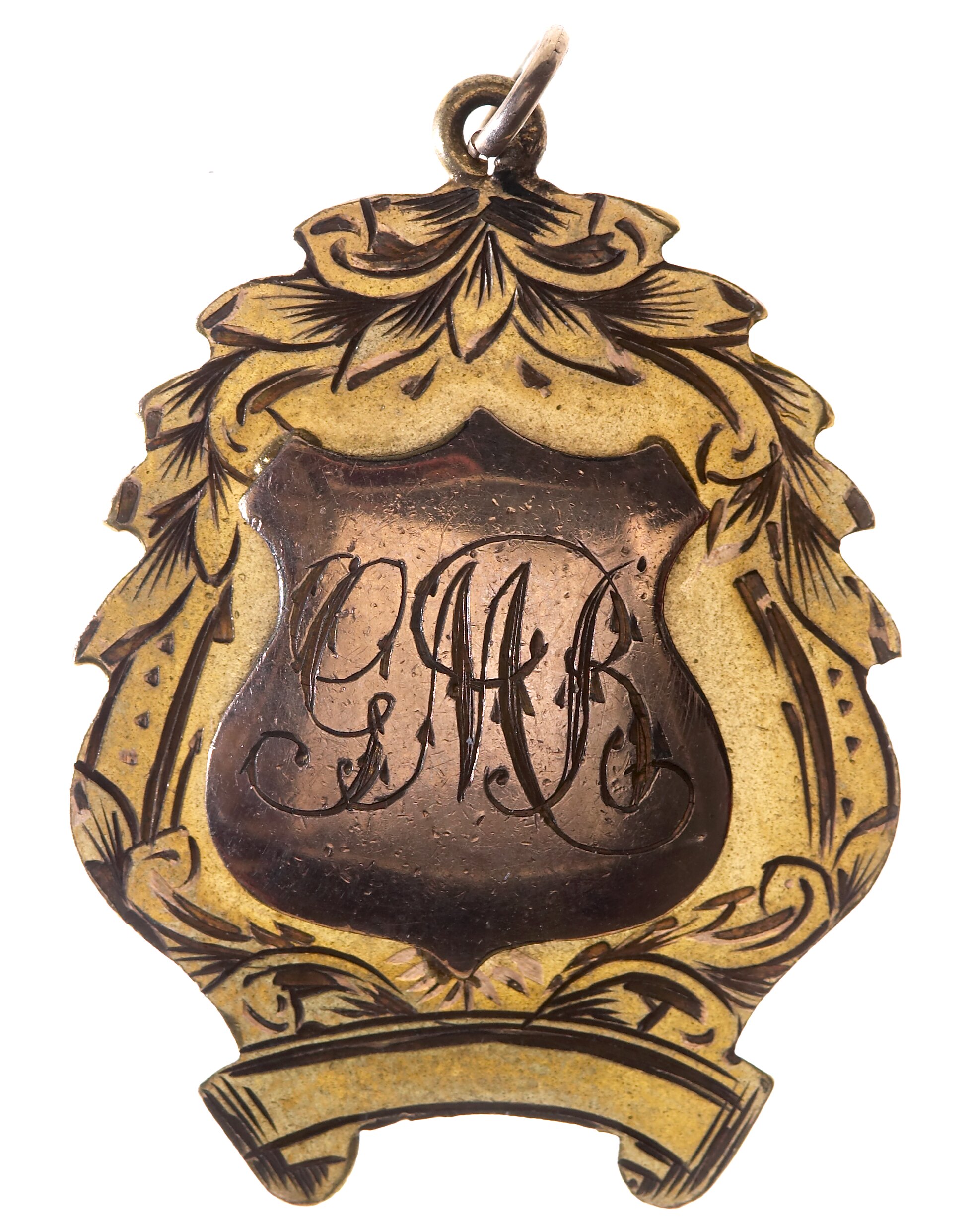 An engraved medal suspended by a loop at the top, it has the winners initials GMB engraved on a shield at the centre.