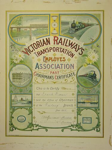 Illuminated certificate with coloured central inscription reading "VICTORIAN RAILWAYS TRANSPORTATION EMPLOYEES ASSOCIATION PAST CHAIRMAN's CERTIFCATE.This is to Certify that Frank Durran held the Office of Chairman of the Geelong Branch. Year 1908."
