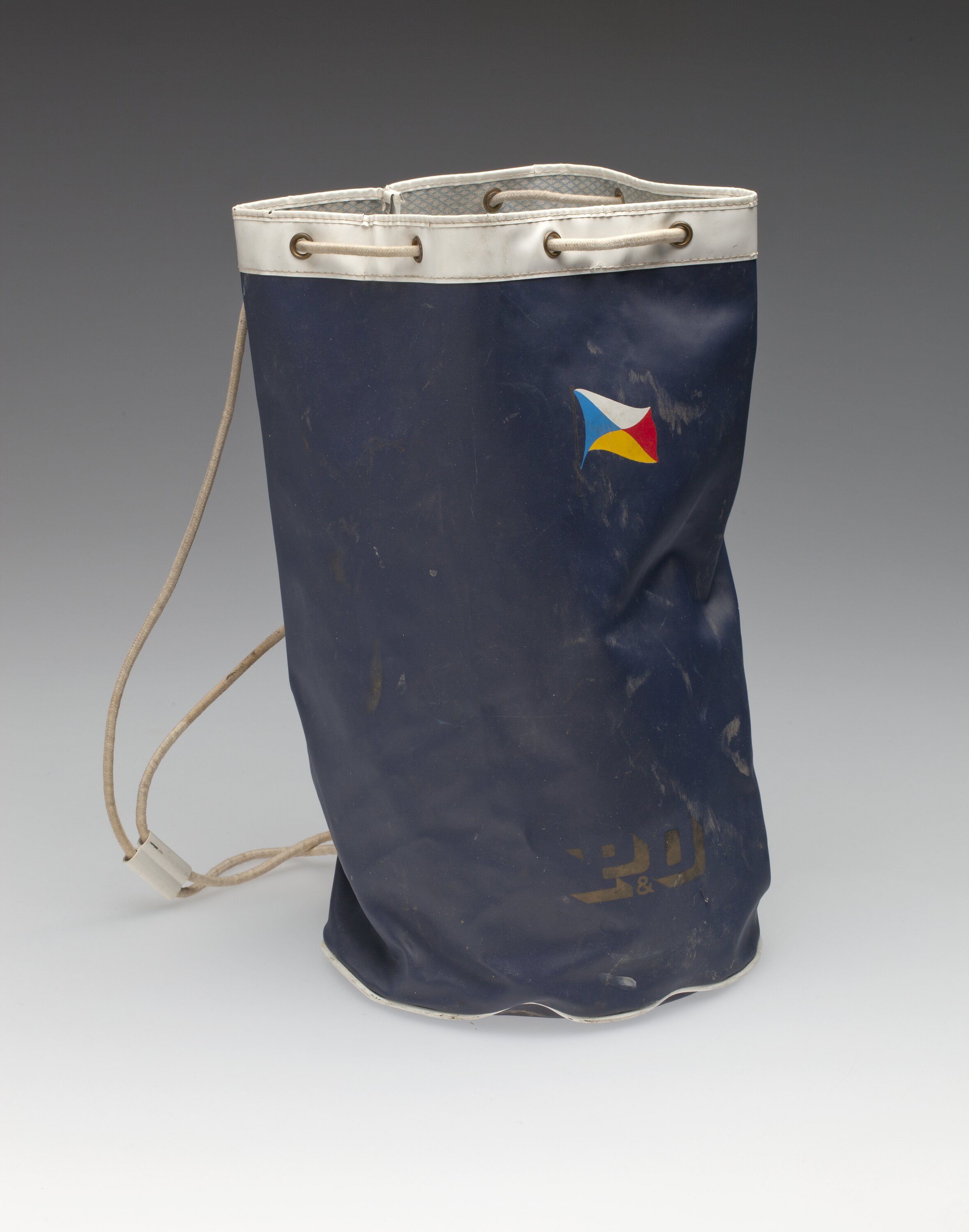 Blue vinyl draw string bag with the P&O logo, used circa 1950s. It is part of a collection of shipboard souvenirs collected by Margaret Wood an officer in the Department of Immigration from 1951-1960. As part of her role Margaret met migrant ships arriving at Station Pier in Melbourne and she often received gifts from ship staff.