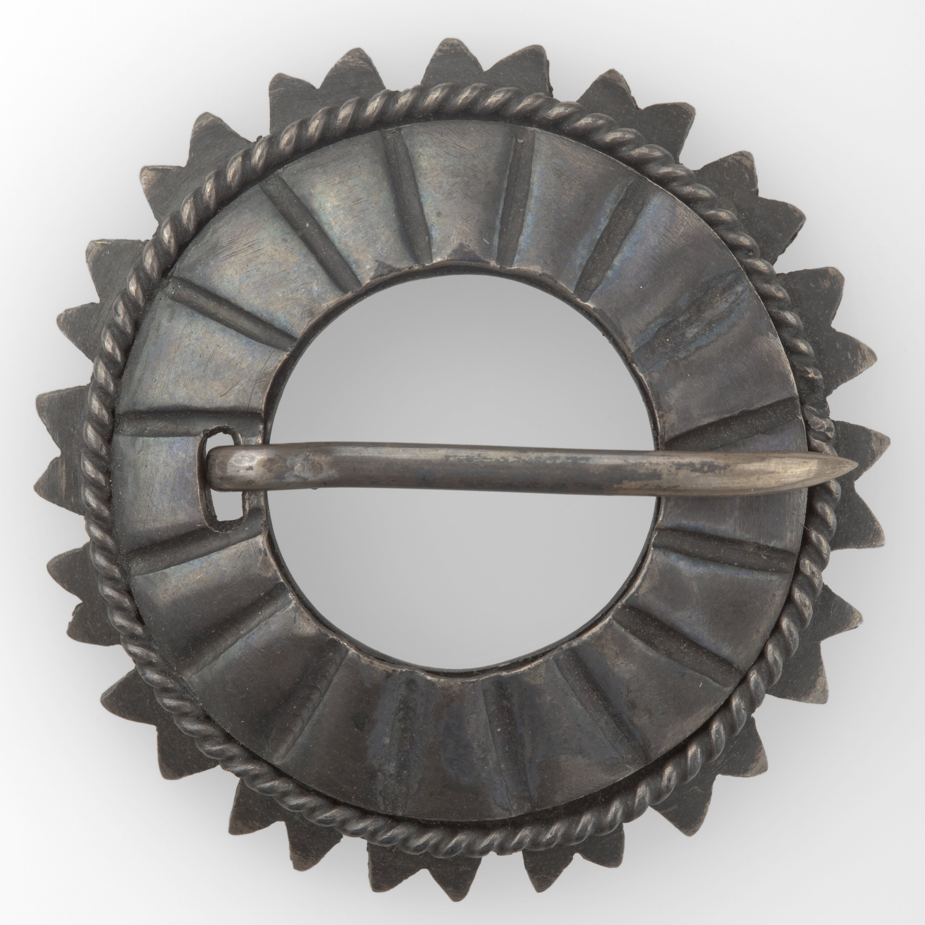 One of a set of three identical round metal brooches in descending size from large to small. The brooch is slightly convex with scalloped decorative edging. It has a hollow centre across which lays a straight pin, hinged at one side. The outer ring is etched with stripes and a decorative rope effect runs around the inner edge.