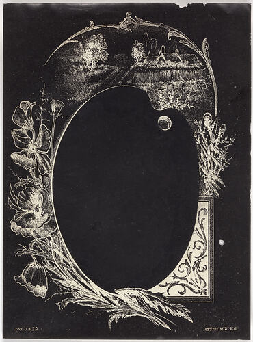 Negative Vignette, of an oval framed by flowers, produced by G.E.A.C., one of a set belonging to Vincenzo Candela, an Italian migrant who came to Australia in 1920 with his wife Emanuela and son Angelo. Used in his photographic business in his hometown of Viggiano, Italy, where he specialised in portraiture, landscapes and village life. Vincenzo continued to use his photographic equipment in Australia, more as a hobby than a trade, taking photos of family members and friends in his home, with impromptu backdrops such as a rug or a sheet.