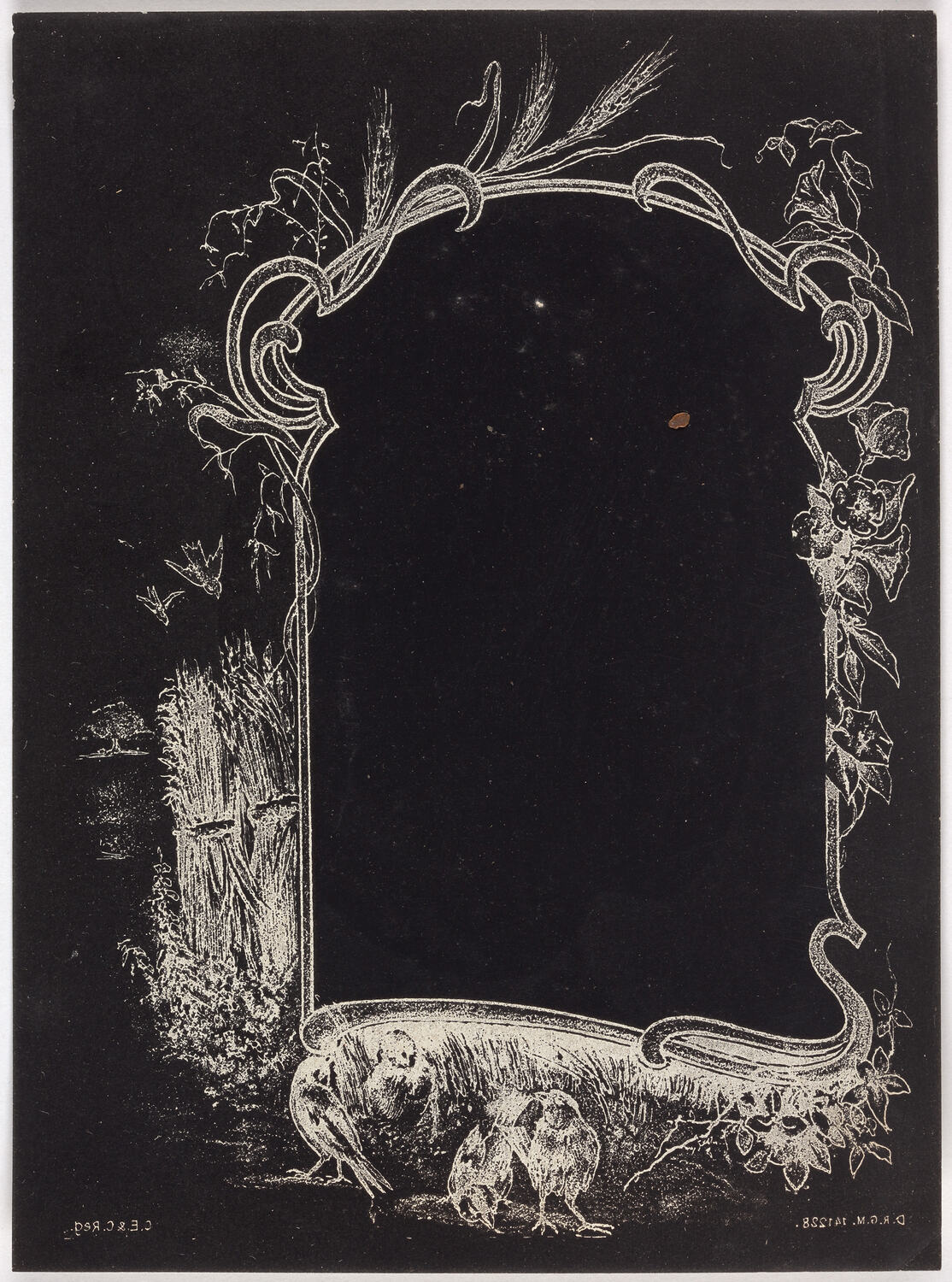 Negative vignette with a rectangular frame in the centre, surrounded by foliage, birds and hay.