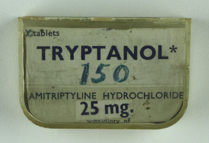 Drug Tryptanol (amitriptyline hydrochloride) is contained in 3 small (25mg) flat plastic boxes with rounded front corners. Contains lead pieces. Original contents were an S4 pharmaceutical.